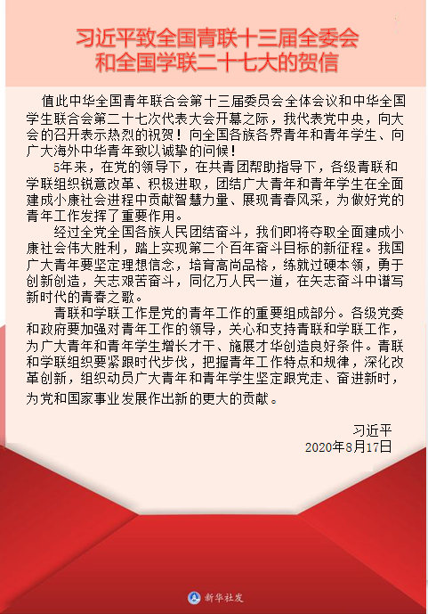 中华全国青年联合会第十三届委员会全体会议、中华全国学生联合会第二十七次代表大会于8月17日至18日在北京召开。8月17日,中共中央总书记、国家主席、中央军委主席习近平致全国青联十三届全委会和全国学联二十七大的贺信中对广大青年提出殷切期望。为进一步贯彻全国学联二十七大会议精神,suncitygroup太阳集团研究生会于10月8日至10月18日在全校研究生范围内组织开展了全国学联二十七大会议精神学习活动。